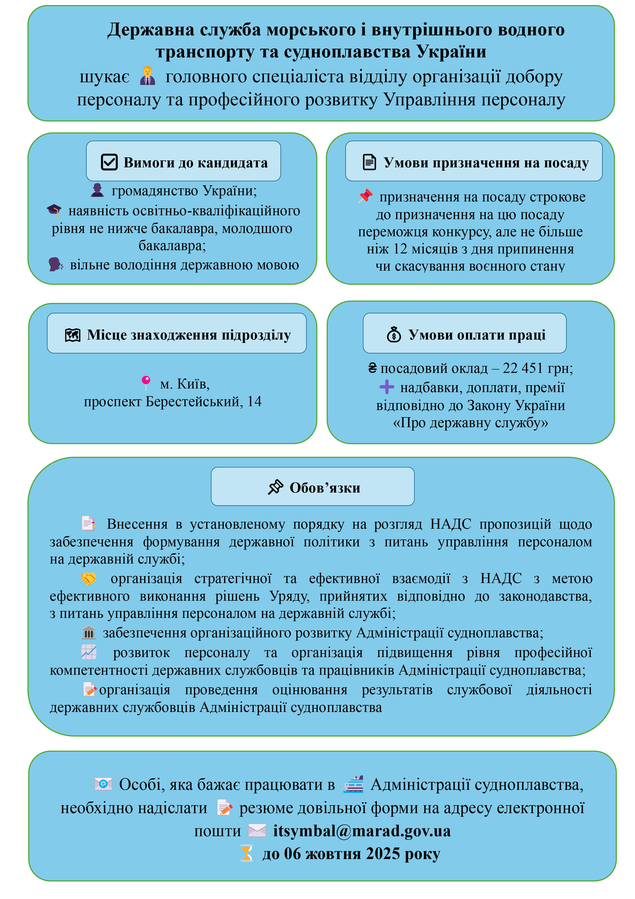 Державна служба морського і внутрішнього водного транспорту та судноплавства України шукає головного спеціаліста відділу організації добору персоналу та професійного розвитку Управління персоналу